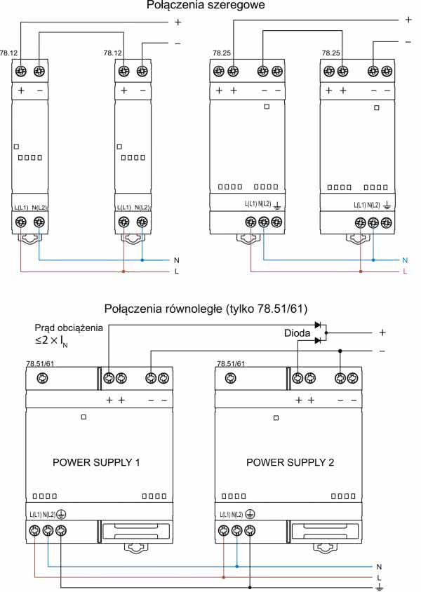 Nasze zasilacze można łączyć szeregowo lub równolegle, w zależności od tego, czy chcemy zwiększyć napięcie np. do 48 V, czy samą moc zasilania. Należy pamiętać, aby przy połączeniach równoległych zamontować dodatkowe diody, tak jak zostało to pokazane na rysunku 1.