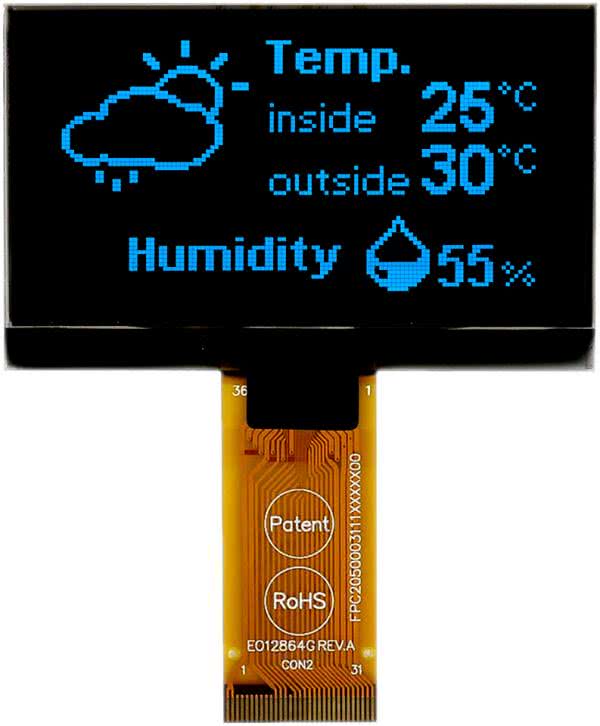 W systemach tego typu sprawdzą się m.in. jednobarwne wyświetlacze OLED, które zapewniają doskonałą czytelność prezentowanych treści, zarówno w świetle, jak i w mroku, bez względu na kierunek obserwacji. Dodatkowo mogą pracować w skrajnych temperaturach, których zakres sięga od –40 do 80°C. Wartymi uwagi są modele OLED z serii WEO012864G od Winstara (fotografia 2). Mają przekątną 2,42 i dostępne są w czterech wariantach kolorystycznych: białym, żółtym, niebieskim i zielonym.