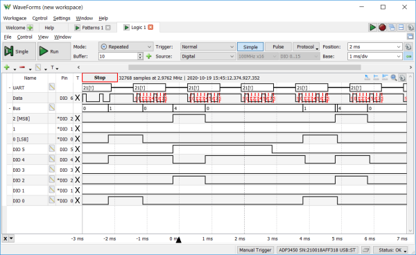 Linie cyfrowe są konfigurowalne: można zmieniać ich kierunkowość i referencyjne napięcie zasilania, w zakresie od 1,2 do 3,3 V. W trybie rejestratora-analizatora urządzenie może automatycznie dekodować protokoły SPI, I2C, UART, CAN, I2S, 1-Wire, HDMI CEC oraz kody Manchester, a także protokoły definiowane przez użytkownika. W trybie generatora sekwencji cyfrowych użytkownik może wykorzystać m.in. funkcje: clock, pulse, random, number, binary counter, Gray counter, Johnson counter, decimal counter, walking 0/1, może także definiować własne wzorce.