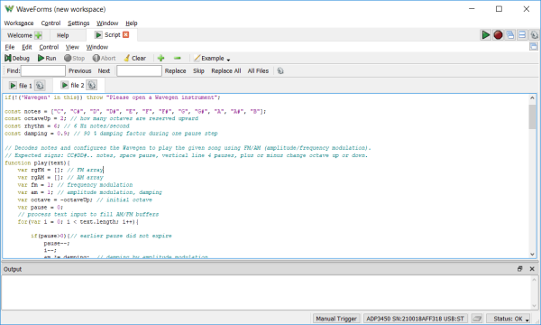 Z poziomu WaveForms są realizowane nastawy wszystkich przyrządów zintegrowanych w urządzeniach, odpowiada ono także za wyświetlanie przebiegów analizowanych i mierzonych sygnałów. Przykładowe widoki okna programu obsługującego Analog Discovery Pro pokazano na rysunkach 1…3. Warto zauważyć, że dzięki wbudowanemu w oprogramowanie edytorowi skryptów, użytkownicy mogą pisać własne procedury testowe w języku JavaScript, dzięki czemu możliwa jest wygodna automatyzacja pomiarów lub analiza ich wyników. Przykład wyglądu okna edytora skryptu pokazano na rysunku 4.