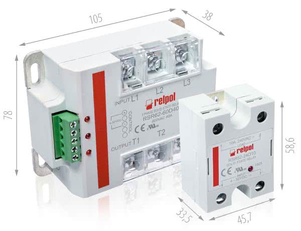 Kolejny przekaźnik półprzewodnikowy RSR45 jest elementem jednofazowym przeznaczonym do montażu na płycie lub radiatorze. Możemy go stosować w różnorodnych aplikacjach takich jak: inkubatory laboratoryjne, automatyka przemysłowa, maszyny przemysłowe, komory temperaturowe, maszyny spożywcze (ekspresy do kawy, podgrzewacze żywności, grille elektryczne, frytownice), szafy sterownicze, itp. Przekaźniki RSR45 załączają obciążenie jednofazowe w zakresie napięć od 24 do 440 V AC przy prądach obciążenia od 10 do 25 A. Przekaźniki te cechują dwie technologie łączenia przewodów co pozwala na zastosowanie go w różnych aplikacjach, a niewielkie wymiary pozwalają na oszczędność miejsca. W przekaźniku wbudowane są układy RC (połączone rezystory i kondensatory) chroniące przed przepięciami oraz sygnalizacja zadziałania LED.