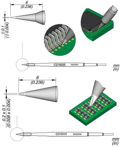 Stacja jest wyposażona w niewielką rękojeść typu T245 o wymiarach 145×20×20 mm o wyjątkowo niewielkiej masie 0,07 kg. To pozwala na swobodne i precyzyjne operowanie tym narzędziem. W razie potrzeby stację można wyposażyć w precyzyjną rękojeść typu T210 o wymiarach 123×14×14 mm i jeszcze mniejszej masie 0,06 kg (fotografia 2). Bogaty asortyment grotów umożliwi realizację wielu trudnych zadań (rysunek 3).