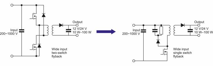 Ponieważ te energooszczędne, izolowane zasilacze impulsowe są używane w różnych zastosowaniach na całym świecie, muszą akceptować na wejściu napięcie z szerokiego zakresu: od 300 nawet do 1000 V i dostarczać niskie napięcie od 5 do 48 V. Być może najpotężniejszą metodą łagodzenia awarii jest uproszczony projekt obwodu. Jak pokazano na rysunku 1, najbardziej niezawodną konstrukcją obwodu jest topologia flyback z jednym przełącznikiem (rysunek 1, po prawej), która zapewnia prostotę i zmniejszoną liczbę komponentów – ta ostatnia daje korzyść w postaci niższych kosztów całkowitych.