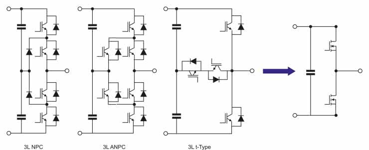 Z punktu widzenia niezawodności, tranzystory SiC MOSFET dają projektantom możliwość uproszczenia topologii obwodu i schematu sterowania, a także zmniejszenia liczby komponentów – co oczywiście wiąże się z niższymi kosztami. Ze względu na zapotrzebowanie na wyższą moc przekształtników średniej mocy stosowane jest wyższe napięcie szyny DC – zwykle między 1000 a 1300 V. Wybierając tranzystory krzemowe przy tak wysokich napięciach w obwodach prądu stałego, wymagania dotyczące wydajności nakazują projektantom wybór spośród kilku złożonych, trójpoziomowych architektur obwodów pokazanych na rysunku 2.