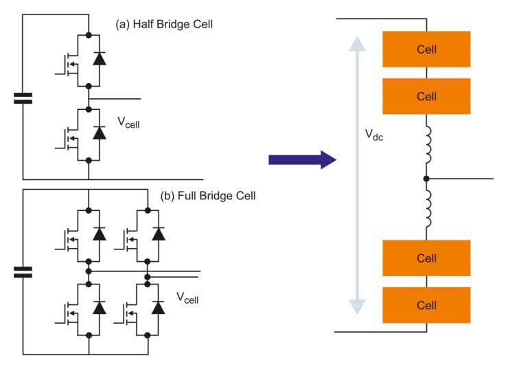 W zakresie mocy wielu megawatów kluczowe czynniki projektowe obejmują łatwą skalowalność i minimalne czynności konserwacyjne, co skłania do stosowania rozwiązań modułowych bazujacych na podstawowym ogniwie jednostkowym. Jak pokazano na rysunku 3, komórki elementarne, czasami określane jako bloki lub podmoduły energoelektroniczne, są skonfigurowane jako kaskadowe konwertery mostka H lub modułowe konwertery wielopoziomowe (MMC).