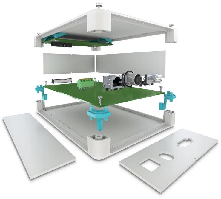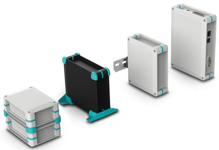 Obudowa UCS składa się z dwóch identycznych elementów tworzących korpus obudowy oraz zdejmowanych paneli bocznych. Jeśli potrzebna jest większa przestrzeń montażowa przy zachowaniu tej samej powierzchni, przy użyciu odpowiednich akcesoriów możliwe jest rozbudowanie systemu do wersji o 20 mm wyższej. Dalsze modyfikacje są możliwe m.in. przez użycie elementów w różnych wariantach kolorystycznych. Zdejmowane panele boczne, łatwe w obróbce, umożliwiają tworzenie różnych wersji projektu dostosowanych do użytych w nim interfejsów (rysunek 2). Przy użyciu adapterów na szynę DIN i dalszych akcesoriów, np. nóżek lub uchwytów naściennych, obudowa do elektroniki UCS może mieć jeszcze bardziej uniwersalne zastosowanie – również w szafie sterowniczej.