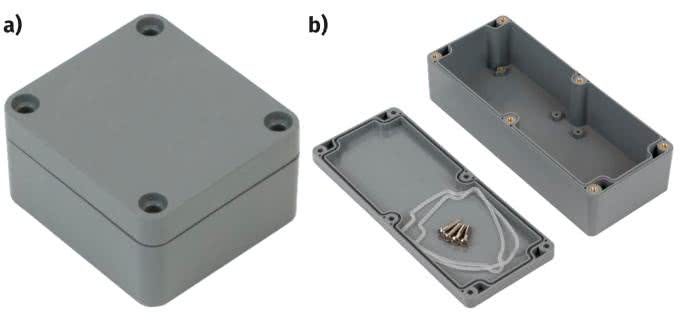Dzięki wzmocnionej konstrukcji obudowa może być stosowana wszędzie tam, gdzie panują trudne warunki. Pomiędzy pokrywą a podstawą znajduje się uszczelka obwodowa, a obie części są łączone za pomocą śrub i mosiężnych insertów. Takie rozwiązania gwarantują, że cała konstrukcja osiąga stopień szczelności na poziomie IP67. Zatem obudowy te są idealnym wyborem dla miejsc, gdzie mamy do czynienia z dużą ilością pyłu lub wody.