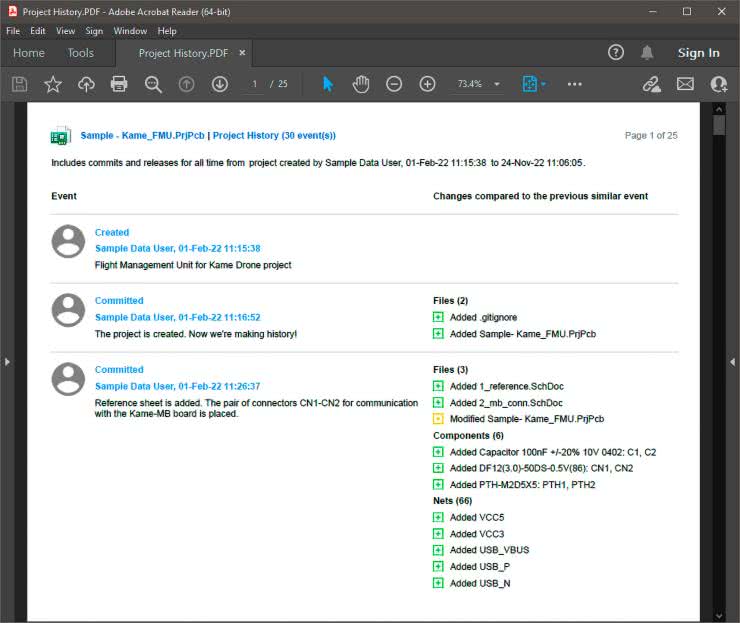 Nowa wersja Altium Designer obsługuje eksportowanie historii projektu (tylko dla projektów zapisanych w wewnętrznym systemie Git w Workspace). Eksport odbywa się do dokumentu PDF w ramach generowania danych wyjściowych, za pośrednictwem pliku Output Job. W ramach konfiguracji można zdecydować, czy wyeksportować całą historię, czy jej część, dotyczącą konkretnych publikacji (rysunek 5).