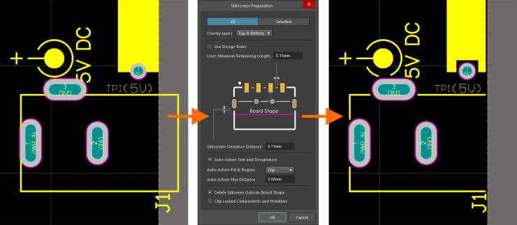 Często napotykanym błędem produkcyjnym jest sitodruk nachodzący się na odsłoniętą miedź, otwory czy krawędź płytki. Teraz można przycinać sitodruk (linie/łuki/wypełnienia/obszary), automatycznie przesuwać opisy na sitodruku oraz automatyczne przycinać lub przesuwać wypełnienia/regiony (rysunek 1). Wszystko jest zautomatyzowane i wykonywane pod nadzorem oprogramowania, aby nie wprowadzać dodatkowych naruszeń DRC lub DFM. Funkcja ta jest dostępna zarówno w edytorze PCB jak i edytorze biblioteki PCB.