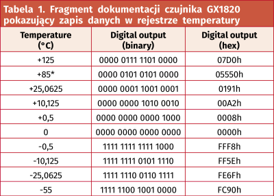 Należy zaznaczyć, że czujniki GX1820, ze względu na wyższą rozdzielczość pomiaru (12 bitów zamiast 9 bitów) nie są kompatybilne z DS1820/DS18S20. Format zapisu danych w rejestrze temperatury pokazano w tabeli 1 i jest on zgodny z DS18B20.