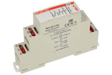 Przykładem takiego elementu jest przekaźnik instalacyjny typu RPI-2P-UNI (fotografia 5) z dwoma stykami o obciążalności 8 A, montowany na szynie DIN. Przekaźnik może być sterowany napięciem z bardzo szerokiego zakresu: 12...240 V, zarówno przemiennym, jak i stałym (AC/DC). Takie cechy pozwalają na stosowanie przekaźnika w systemach o różnych poziomach zasilania oraz w obwodach z zasilaniem o niestandardowej wartości.