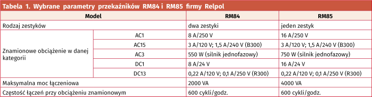 Choć przekaźniki tego typu produkowane są od wielu lat, to producent stale udoskonala konstrukcję i poprawia parametry, m.in. została zmniejszona moc cewki sterującej oraz powiększona wytrzymałość napięciowa. Wszystko to poprawia ich żywotność i niezawodność. Wybrane parametry przekaźników RM84/85 zestawiono w tabeli 1.