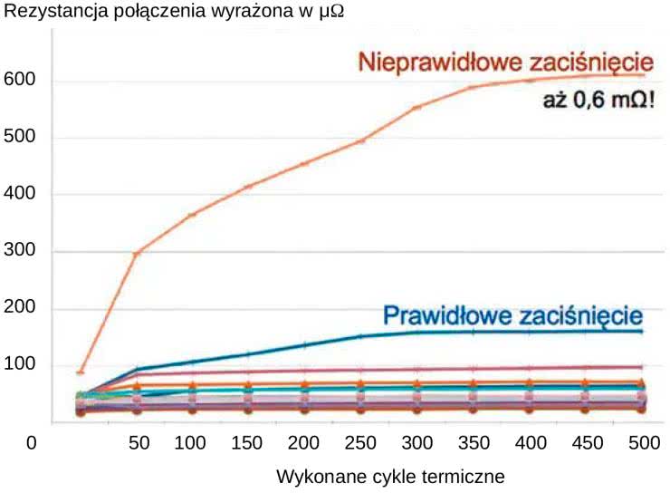 Prawidłowa maksymalna rezystancja zaciśnięcia nie powinna przekraczać 50 μΩ