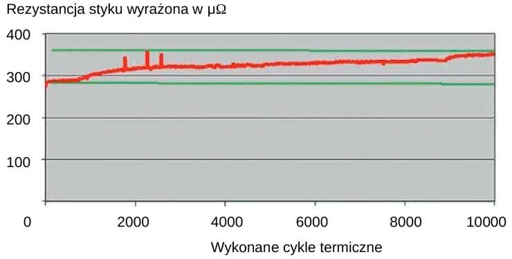 W przypadku złej jakości połączenia następuje duży wzrost rezystancji, która dodatkowo rośnie wraz ze wzrostem temperatury. Przeprowadzone testy pokazały, że sytuacja pogarsza się także z każdym kolejnym cyklem grzania i chłodzenia - wyniki zostały pokazane na wykresie z rysunku 3. Rezystancja nieprawidłowego połączenia z czasem przekroczyła 600 μΩ!