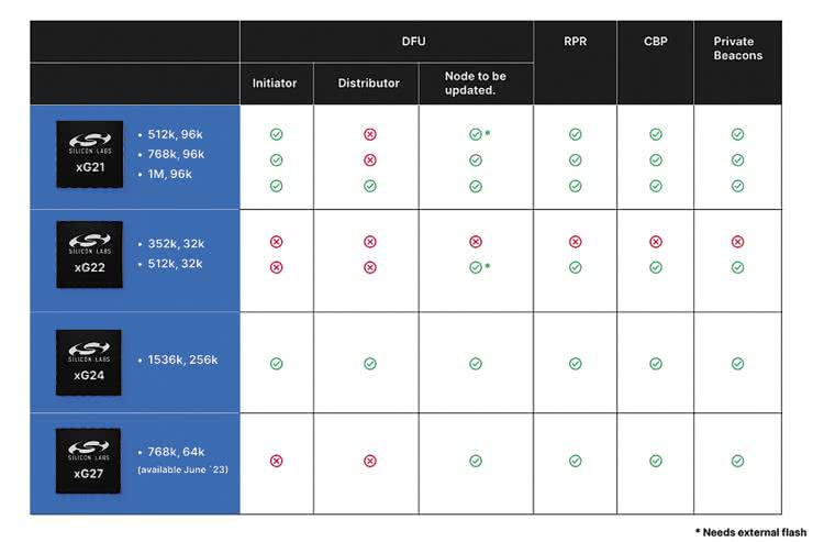 - kluczowe produkty dla urządzeń Bluetooth: EFR32BG22 i EFR32BG24,