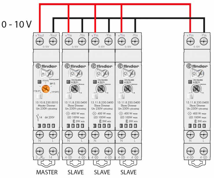 System bazujący na strukturze Master + Slave pozwala regulować różne rodzaje opraw jednocześnie. Moduł Master 15.10 odpowiada za odbieranie sygnału z włącznika ściennego monostabilnego (dzwonkowego), w przypadku przyciśnięcia włącza i wyłącza oświetlenie, a w przypadku przytrzymania rozjaśnia lub ściemnia oświetlenie. Master jest również odpowiedzialny za komunikację z urządzeniami 15.11 czyli Slave, do których wysyła sygnał standardu 0–10 V lub 1–10 V. Maksymalnie możemy dołączyć do 32 urządzeń Slave. Oczywiście sygnał w standardzie 0–10 V jest uniwersalny, więc równie dobrze może być używany do sterowania statecznika lub innego urządzenia, które obsługuje ten rodzaj sterowania.