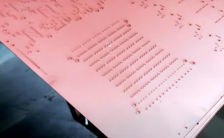 Musimy teraz wywiercić otwory, które następnie utworzą połączenia elektryczne w wielowarstwowej płytce PCB. Jest to proces wiercenia mechanicznego, który należy zoptymalizować, aby uzyskać pasowanie do wszystkich połączeń warstwy wewnętrznej - fotografia 5. W tym procesie panele można układać w stosy. Wiercenie można również wykonać za pomocą wiertarki laserowej.