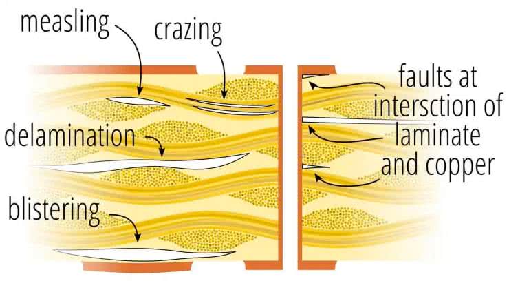 - Delamination/blistering (delaminacja/pęcherze) - separacja w materiale bazowym, pomiędzy poszczególnymi warstwami splotu (warstwami) lub pomiędzy materiałem bazowym, folią miedzianą lub powłoką (taką jak maska lutownicza).