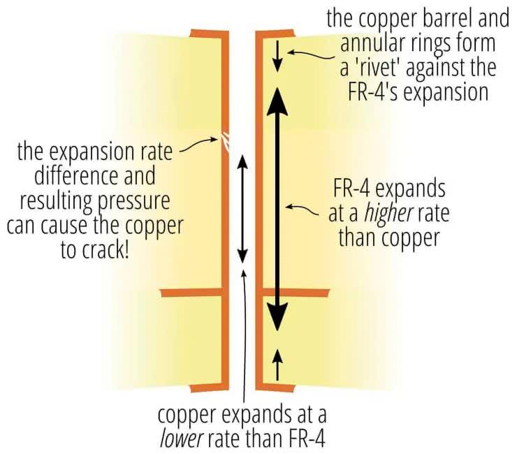Prowadzi to do bardzo dużego wzrostu rozszerzalności po przekroczeniu Tg, co prawie na pewno ma miejsce podczas lutowania. Szczególny problem budzą platerowane otwory i przelotki, które tworzą miedziane nity - pierścienie na górze i na dole, połączone tuleją w laminacie. Współczynnik CTE miedzi wynosi około 17 ppm/°C, podczas gdy współczynnik CTEz jest znacznie wyższy (CTEx, CTEy mają współczynnik CTE zbliżony do współczynnika CTE miedzi). Oznacza to, że wraz ze wzrostem temperatury laminat rozszerza się bardziej niż miedź, co może spowodować pęknięcie korpusu lub oderwanie się podkładek od powierzchni PCB (rysunek 3). Ryzyko to zwiększa się w przypadku powtarzających się cykli i czasu, przez jaki płytka PCB znajduje się w określonych temperaturach.