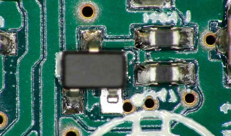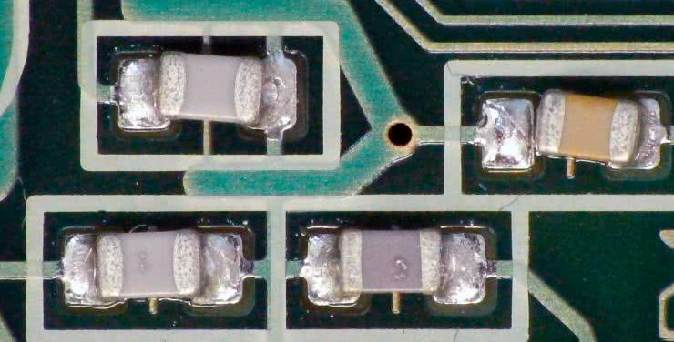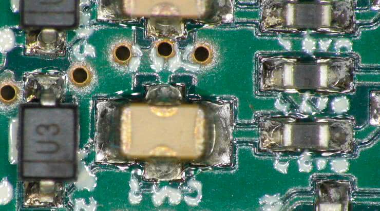 Czasem wydaje się to wygodne, gdy jest mało miejsca na płytce, ale jest to źródło potencjalnych problemów. Podczas lutowania rozgrzane spoiwo z pola wpływa do otworu przelotki i często pod wyprowadzeniem komponentu zostaje tylko jego minimalna ilość. Takie połączenie łatwo się uszkadza i może pęknąć na skutek naprężeń w płytce (fotografia 2).