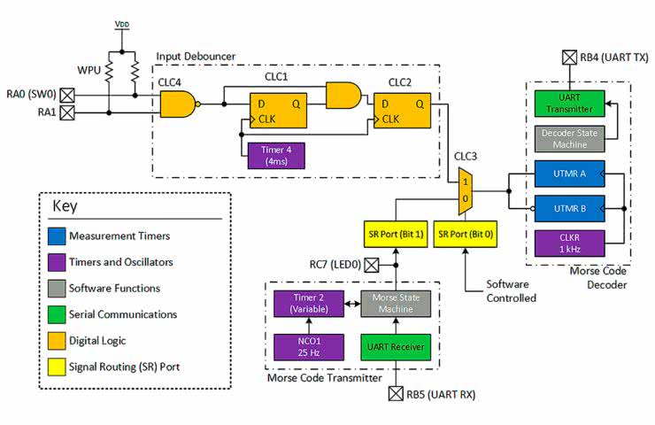 Implementacja multipleksera przy użyciu CLC umożliwia programowi zmianę wejść w dowolnym momencie bez konieczności wykonywania za każdym razem sekwencji odblokowania. Ten scenariusz użycia został użyty w programie demonstracyjnym prostego nadajnika i odbiornika alfabetu Morse’a, wykonanego na bazie mikrokontrolera z rodziny PIC18F56Q71 firmy Microchip - multiplekser służy tutaj do wyboru pomiędzy wyjściem nadajnika a zewnętrznym sygnałem wejściowym (odbiorczym) - schemat takiej implementacji można zobaczyć na rysunku 4.