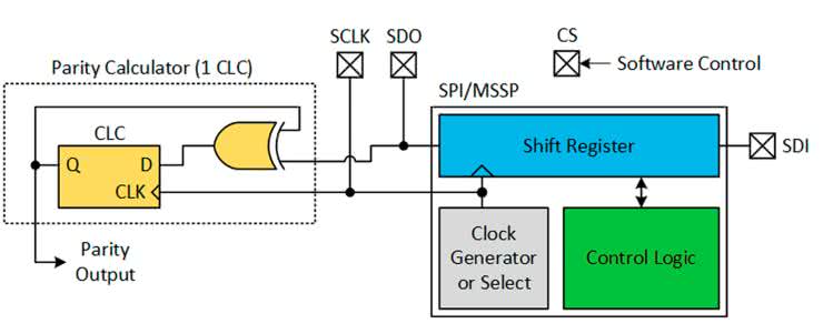 Aby przyspieszyć obliczenia bitu parzystości, można użyć sprzętowego interfejsu SPI w połączeniu z CLC. Blok SPI zawiera szeregowy rejestr przesuwny do przesyłania i odbierania danych. Wyjście rejestru oraz sygnał zegarowy SPI można wprowadzić do CLC, zaś na wyjściu przerzutnika zastosowanej komórki logicznej dostępna będzie informacja o parzystości słowa, znajdującego się w rejestrze.