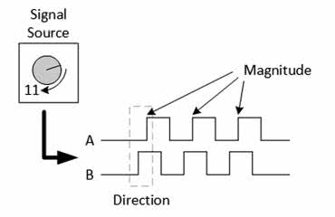 Innym przypadkiem użycia CLC jest implementacja dekodera kwadraturowego. Inkrementalne enkodery z wyjściem kwadraturowym generują dwa przebiegi prostokątne (A i B), przesunięte w fazie o 90°. Prędkość obrotowa jest reprezentowana przez liczbę przebiegów, natomiast znak różnicy fazy pozwala określić kierunek obrotów (rysunek 2).
