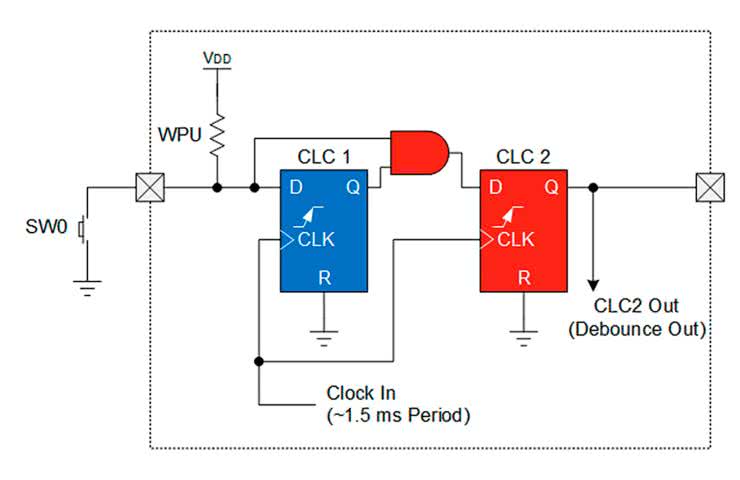 Aby zaimplementować filtr drgań styków, należy jedną z komórek (CLC 1 na schemacie wg rysunku 1) skonfigurować jako przerzutnik typu D, zatrzaskujący stan z wejścia GPIO, podłączonego do przycisku lub przełącznika. Blok CLC 2 wykonuje natomiast operację iloczynu logicznego (AND) sygnału wyjściowego przerzutnika CLC 1 oraz aktualnego stanu wejścia cyfrowego, a następnie zatrzaskuje wartość wynikową we własnym przerzutniku. Źródłem sygnału taktującego dla obu przerzutników jest wyjście timera lub oscylatora, pracującego z częstotliwością około 0,67 kHz.