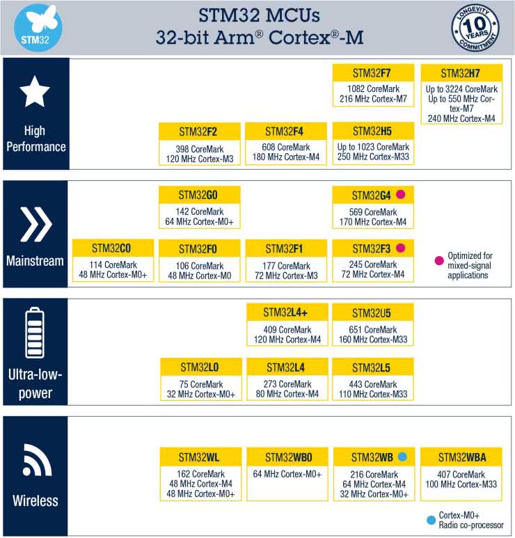 ST Microelectronics to jeden z potentatów na rynku nowoczesnych mikrokontrolerów z rdzeniem ARM. Wszystkie oferowane przez producenta układy można podzielić na cztery główne grupy (rysunek 1): procesory „radiowe” (z wbudowanym transceiverem), ultraenergooszczędne, a także układy standardowe (do typowych aplikacji) oraz mikrokontrolery o wysokiej wydajności, przeznaczone do zastosowań związanych m.in. z obsługą multimediów, systemów operacyjnych wysokiego poziomu itp.