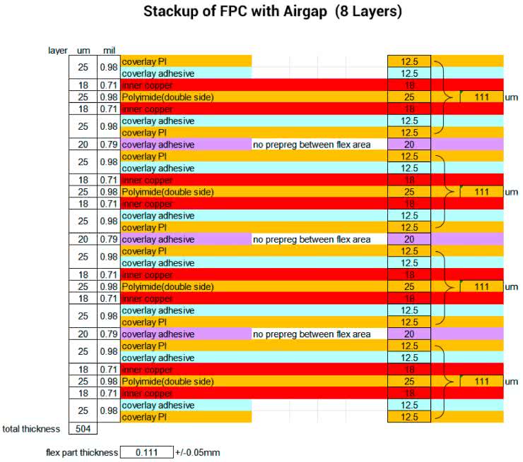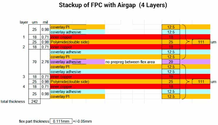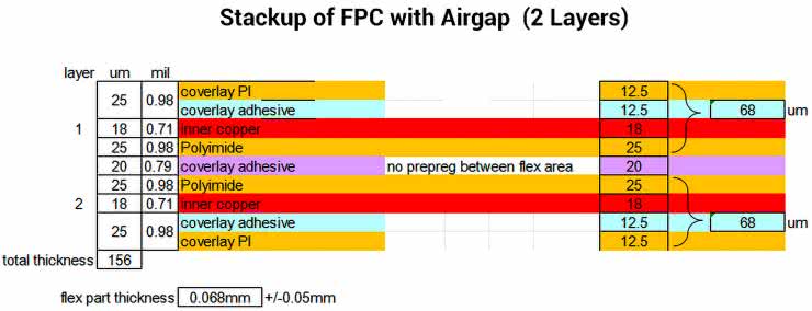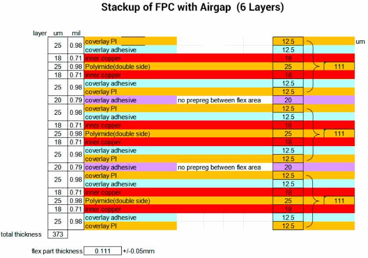 Szczególną odmianą wielowarstwowych obwodów elastycznych są konstrukcje ze szczeliną powietrzną (ang. airgap), tj. całkowicie pozbawione warstwy prepregu w części giętkiej. PCBWay wytwarza tego rodzaju płytki drukowane w wersjach 2-, 4- 6- i 8-warstwowych – odpowiednie konstrukcje stosu można zobaczyć na rysunkach.