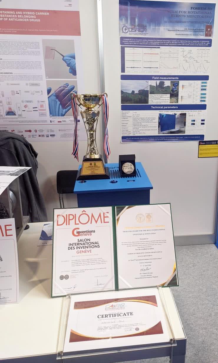 W połowie kwietnia, podczas Targów International Exhibition of Inventions w Genewie (fotografia 1), firma została wielokrotnie wyróżniona i nagrodzona Srebrnym Medalem Targów (fotografia 2) za urządzenie FOSREM!
