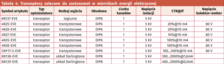 Transoptory znajdą również zastosowanie jako izolacja galwaniczna w aplikacjach mierników energii. Ponadto są stosowane jako elementy sprzężenia zwrotnego w układzie – transoptory analogowe dostarczają informacji na temat parametrów, takich jak napięcie i prąd układu, pozwalając tym samym na dokładny pomiar zużycia energii. Natomiast transoptory cyfrowe, poprzez dostarczanie informacji w postaci binarnej, zapewniają kontrolę nad prawidłowym działaniem miernika. W tabeli 4 zebrano transoptory zalecane do zastosowań w miernikach energii elektrycznej.