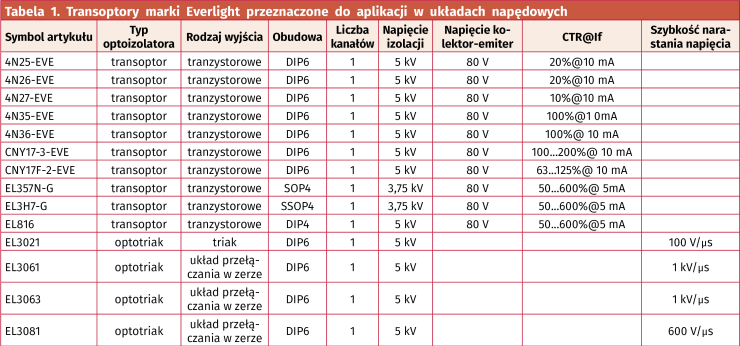 W tabeli 1 zaprezentowane zostały transoptory marki Everlight, przeznaczone do aplikacji w układach napędowych.