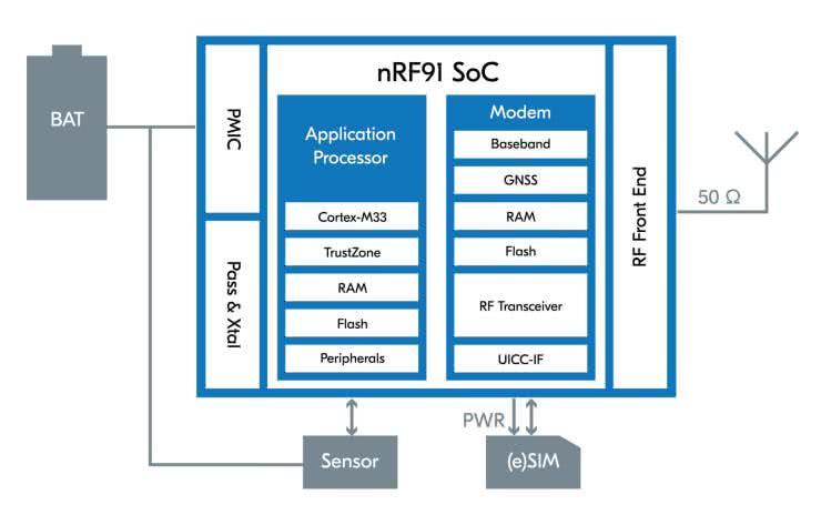 W odróżnieniu od wcześniej opisanych układów, seria nRF91 została opracowana przede wszystkim z myślą o łączności globalnej. Obecnie w ramach opisywanej serii znajdują się trzy moduły klasy SiP, przy czym wszystkie obsługują nowoczesną łączność M2M w standardach LTE-M i NB-IoT oraz nawigację satelitarną (GNSS). Układy bazują na 64-megahercowych procesorach ARM Cortex-M33 wyposażonych w sporą pamięć Flash (1 MB) oraz RAM o pojemności 256 kB. Do dyspozycji konstruktorów są interfejsy TWI, SPI, I²S oraz UART, a także 4 kanały PWM, linie PDM, wbudowane przetworniki ADC, timery oraz zegary czasu rzeczywistego (RTC). Taki poziom integracji zapewnia możliwość zrealizowania kompletnego urządzenia, w którym całość funkcjonalności jest zaimplementowana w samym module SiP, bez konieczności używania dodatkowego (zewnętrznego) mikrokontrolera. Na transceiverze oraz procesorze aplikacyjnym nie kończy się jednak lista bloków zintegrowanych w ramach tych niewielkich modułów – wewnątrz znajduje się bowiem także system zarządzania zasilaniem (PMIC) oraz obwody taktowania z rezonatorem kwarcowym i niezbędnymi elementami pasywnymi. Całość tworzy zatem ultranowoczesne rozwiązanie w pełni zasługujące na miano System-in-Package.