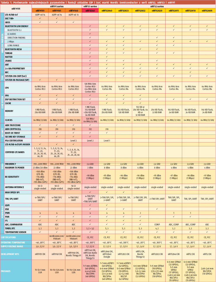 Większość osób, które miały okazję pracować z układami oraz modułami bazującymi na rozwiązaniach marki Nordic Semiconductor, w pierwszej chwili kojarzy ją zapewne z przedstawicielami niezwykle popularnej serii nRF52, obejmującej siedem modeli układów SoC przeznaczonych do pracy przede wszystkim w energooszczędnych urządzeniach przenośnych, sensorach IoT, inteligentnym sprzęcie AGD i wielu innych klasach produktów. W zależności od wersji poszczególni przedstawiciele opisywanej rodziny układów SoC obsługują nie tylko podstawową łączność BLE, ale także bardziej zaawansowane jej odmiany – oferują m.in. wsparcie precyzyjnej lokalizacji urządzeń wewnątrz pomieszczeń (direction finding), łączność dalekiego zasięgu (long range), połączenia typu Bluetooth Mesh, a także szereg innych protokołów komunikacyjnych: Thread, Matter, ZigBee, ANT oraz własnościowy standard transmisji w paśmie ISM 2,4 GHz. Mało tego – układy nRF52840, nRF52833 oraz nRF52832 mają nawet wbudowany interfejs NFC integrujący w sobie niemal wszystkie elementy niezbędne do uruchomienia komunikacji zbliżeniowej (do pracy wystarczy zewnętrzna antena wraz z parą odpowiednio dobranych kondensatorów ceramicznych). Wszystkie układy SoC z serii nRF52 bazują na 64-megahercowym procesorze ARM Cortex-M4 i mają wbudowaną pamięć Flash o pojemności od 192 kB do 1 MB oraz RAM o rozmiarze od 24 kB do 256 kB. Najmniejszy członek rodziny nRF52 – układ nRF52805 – ma wymiary zaledwie 2,48×2,46 mm, dzięki czemu nadaje się do urządzeń przenośnych i ubieralnych o największych ograniczeniach pod względem przestrzeni dostępnej wewnątrz obudowy.