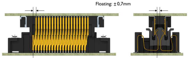 Ruchoma część gniazda gwarantuje bardzo wysoką kompensację tolerancji i pozwala na zminimalizowanie naprężeń mechanicznych w połączeniu. Jest to zaleta zarówno podczas łączenia, jak już po podłączeniu, w warunkach docelowej eksploatacji. Siły działające na złącze oraz połączenia lutowane są redukowane przez sprężynujące działanie styków pływających – co skutkuje wyjątkowo niezawodnym i długotrwałym, stabilnym połączeniem płytka-płytka. Pływające styki umożliwiają kompensację tolerancji produkcyjnych, które występują nieuchronnie podczas montażu płytek drukowanych. Urządzenia, w których w procesie łączenia płytki drukowane używają dodatkowego prowadzenia, korzystają z dużych tolerancji kompensujących niewspółosiowość podczas zestawiania złączy. To z kolei przekłada się na mniejszą liczbę awarii w procesie montażu i umożliwia optymalizację szybkości podłączania. Oznacza to, że pływające złącze ma bezpośredni wpływ na wydajność procesu instalacji.
