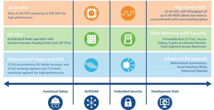- Jednostka zmiennoprzecinkowa podwójnej precyzji (DP-FPU) jest zgodna z normą IEEE 754-2019, obsługuje pojedynczą i podwójną precyzję z dedykowanym potokiem, zwiększając szybkość pętli sterowania i redukując błędy oprogramowania związane ze skalowaniem zmiennych. Obejmuje sprzętowe wsparcie obliczeń trygonometrycznych (funkcje sinusoidalne i cosinusoidalne) dla jeszcze wydajniejszego sterowania napędami elektrycznymi.