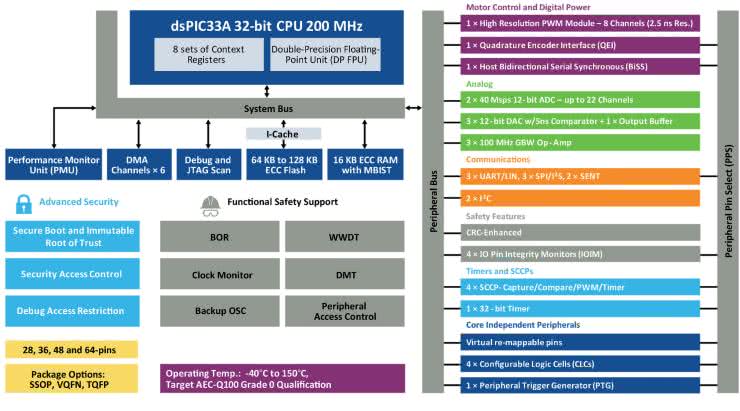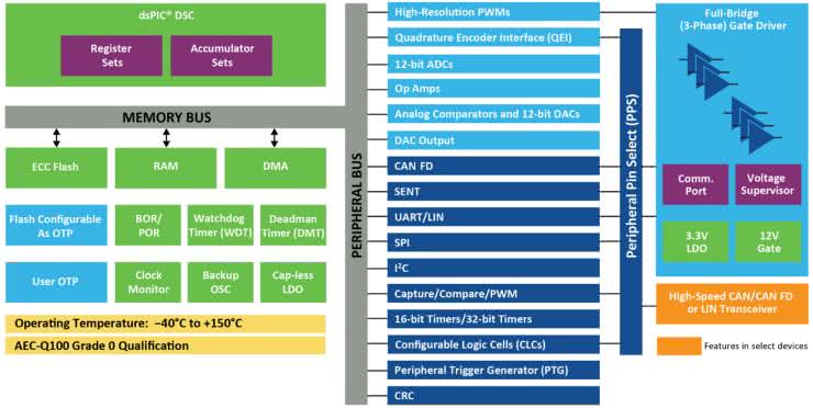 Sterowniki zintegrowane z omawianej rodziny działają na pojedynczym zasilaniu do 29 V (praca ciągła)/40 V (stany przejściowe) i zapewniają wysoką wydajność obliczeniową dzięki taktowaniu do 70...100 MHz. Ułatwiają wydajną implementację FOC i innych zaawansowanych algorytmów sterowania silnikiem. Wbudowany stabilizator LDO 3,3 V zasila rdzeń dsPIC, eliminując potrzebę stosowania zewnętrznego regulatora liniowego bądź DC/DC.