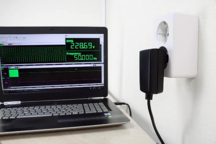 Podłączenie bezpośrednio do sieci zasilającej. Handyscope TP450 to analizator jakości zasilania podłączany przez USB do komputera. Zakres wejściowy do ±450 V pozwala podłączyć go bezpośrednio do gniazdka ściennego (110 V AC/230 V AC) w celu pomiaru napięcia sieciowego. Nie jest wymagany żaden dodatkowy tłumik.