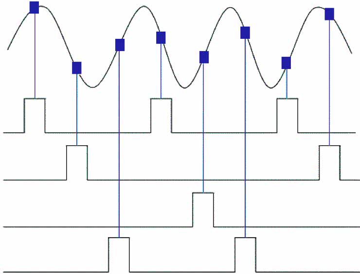 Oscyloskopy samplingowe umożliwiają jednak pomiary szybko zmieniających się sygnałów w pasmach o bardzo wysokich częstotliwościach. Ich ograniczeniem jest możliwość obserwacji jedynie powtarzalnych przebiegów sygnałów. Urządzenia te pobierają próbki napięcia sygnału wejściowego i zapamiętują je. Przy każdym kolejnym sygnale bramka wejściowa otwiera się na bardzo krótki czas, z pewnym deterministycznym przesunięciem w czasie (rysunek 1). Rekonstrukcja sygnału wejściowego odbywa się na podstawie zestawienia próbek z kolejnych akwizycji. Do podstawowych cech tej technologii można zatem zaliczyć wielokrotne przechwytywanie pojedynczych wartości napięcia w różnych momentach. Do dokładnego odtworzenia przebiegu wymagana jest zatem powtarzalność wzorca sygnału – w przeciwnym wypadku zrekonstruowany przebieg będzie zawierał niemożliwe do usunięcia artefakty.