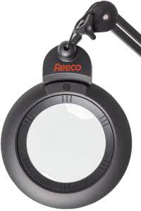Firma REECO – znany producent szerokiej gamy wyposażenia dla elektroników – oferuje sześć różnych modeli lup warsztatowych z wbudowanym oświetleniem pierścieniowym LED. Poszczególne modele róznią się mocą optyczną soczewki (3 lub 5 dioptrii), kolorem i kształtem obudowy, a także rozmiarem soczewki. Cennym ułatwieniem pracy jest czteropoziomowa kontrola natężenia światła w sekwencji 25%…50%…75%…100%.