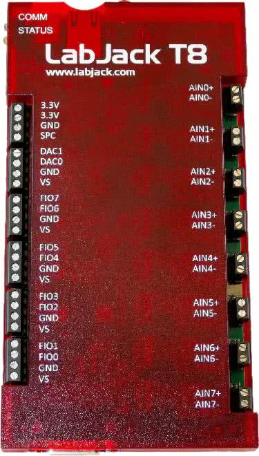 W większości typowych aplikacji stosowane są systemy akwizycji danych o znacznie mniejszej przepustowości, przy czym nacisk jest zwykle położony na łatwość implementacji i wysoką rozdzielczość akwizycji – jako przykład można wymienić wielokanałowe pomiary napięć w systemach ATE, pomiary temperatury w kilku punktach czy też systemy sygnałów mieszanych, integrujące zarówno wejścia i wyjścia analogowe, jak i cyfrowe linie GPIO, pozwalające na bezpośrednią współpracę z zewnętrznym mikrokontrolerem czy też modułami wykonawczymi (np. przekaźnikowymi). To wszystko (i znacznie więcej) oferują karty DAQ USB marki LabJack. Flagowy model tego producenta – LabJack T8 (fotografia 7) – pozwala na prowadzenie pomiarów w 8 różnicowych, izolowanych do 1 kV kanałach analogowych i zapewnia rozdzielczość 24 bitów przy częstotliwości próbkowania do 40 kSa/s w każdym kanale.