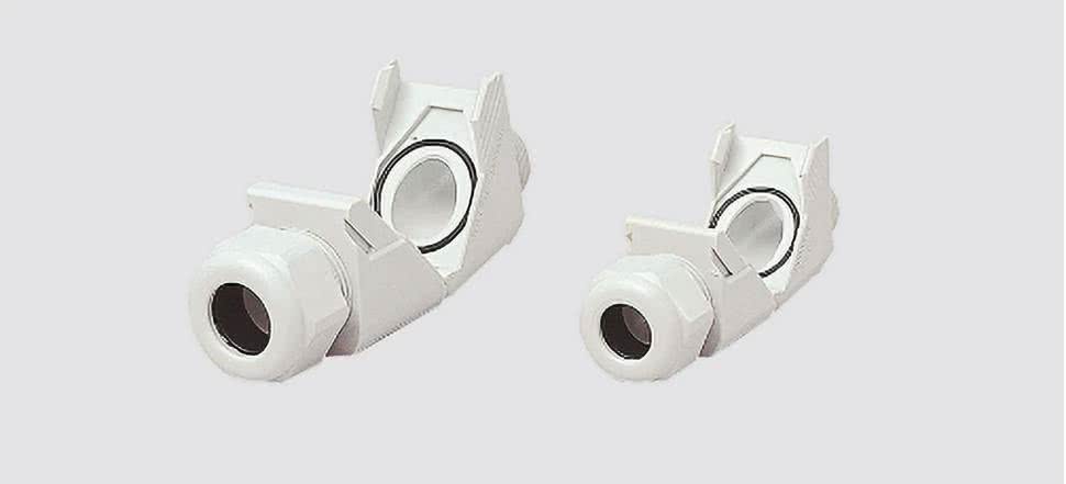 Bardzo ciekawą ofertę stanowią poliamidowe dławiki kątowe (fotografia 4), które oddają nieocenione zasługi w sytuacji, gdy wyjście kabla pod kątem prostym w stosunku do ścianki skrzynki sterowniczej jest kłopotliwe lub niemożliwe. Przez otwarty dławik można swobodnie przeprowadzić przewód, a po zamknięciu całość zatrzaskuje się, nie pozostawiając możliwości samoczynnego lub przypadkowego otwarcia.