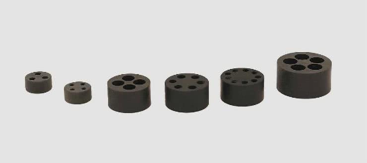 Do dławików HELUTOP HT są dostępne wkładki wielootworowe (fotografia 9) oraz kołki zaślepiające, co daje możliwość wprowadzania przez jeden dławik wielu przewodów, bez znaczącej utraty szczelności całego zespołu (IP68). Dostępne kolory to: czarny, szary i jasnoszary.