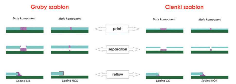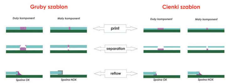 Po uniesieniu szablonu znad powierzchni płytki pasta powinna pozostać w całości na polach lutowniczych. Zależności pozwalające na dobór zarówno grubości, jak i szerokości otworów w szablonie są dobrze znane i opisane w normie IPC-7525.