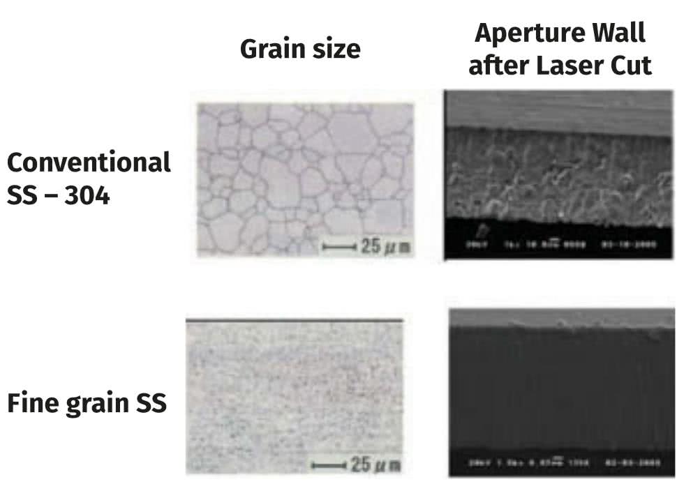 Materiały te w różnym stopniu ulegają erozji laserowej podczas wycinania laserowego. Materiały o drobnym ziarnie – stal fine grain oraz nikiel – charakteryzują się gładszą powierzchnią ścianek bocznych, co skutkuje lepszym uwalnianiem pasty dla elementów z małymi rastrami (fotografia 1).