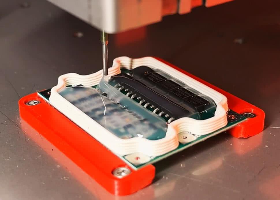 Jednym z rozwiązań odpowiadających na te potrzeby jest technologia znana jako DAM & FILL, co można swobodnie przetłumaczyć jako „bariera i wypełnienie”. W pierwszym etapie materiał o wysokiej lepkości, najczęściej jednoskładnikowy klej silikonowy o konsystencji pasty, jest dozowany jako „ściana” (dam) wzdłuż krawędzi lub wokół chronionego obszaru płytki PCB. Działa to jak mur oporowy lub tama zapobiegająca rozlewaniu się rzadszej zalewy, która zostanie użyta w drugim etapie. W kolejnym kroku przestrzeń wewnątrz tej bariery jest wypełniana materiałem o niskiej lepkości (fill) – może to być płynna zalewa silikonowa jedno lub dwuskładnikowa. Grubość warstwy zalewy wypełniającej zwykle wynosi około 5…10 mm, ale przy zastosowaniu zalew 2-składnikowych grubość może wynosić kilka centymetrów. Metoda DAM & FILL, chociaż wymaga dwóch oddzielnych etapów aplikacji, jest ceniona i często obecnie stosowana jako skuteczny sposób na hermetyzację elektroniki.