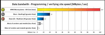Automatyzacja operacji programowania to jeden sukces. Drugi to nowa, szybka technologia programowania pamięci Flash o dużej pojemności, zaprezentowana również na targach Productronica 2013, a stawiająca Elnec pod względem osiągów na drugim miejscu na świecie. Diagram pokazuje porównanie światowych liderów konkurencji szybkości programowania pamięci Flash (rysunek 7).