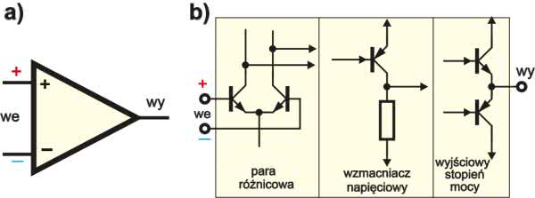 Historia wzmacniaczy operacyjnych to przede wszystkim opowieść o polepszaniu ich parametrów, stosownie do aktualnych możliwości technicznych. Najpierw powstawały wzmacniacze operacyjne lampowe, potem tranzystorowe. Symbol graficzny wzmacniacza operacyjnego jest pokazany na rysunku 1a. Na wejściu zawsze pracuje para różnicowa złożona z dwóch jednakowych elementów. Wiele wzmacniaczy operacyjnych ma budowę trzystopniową, co w dużym uproszczeniu pokazane jest na rysunku 1b.