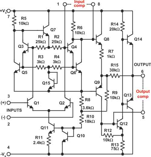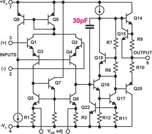 Wzmacniacz μA741 nie ma takiej możliwości. Jego właściwości dynamiczne (szybkość) są słabe. O ile na przykład wzmacniacze μA709 i LM101 nadawały się do układów audio, o tyle μA741 był do tego zbyt powolny. Jednak to on osiągnął niebywałą popularność głównie dlatego, że w wielu zastosowaniach szybkość nie była kluczowym parametrem, a kostka nie wymagała elementu(-ów) do kompensacji zewnętrznej. Fullagar zastosował bodaj najprostszy sposób kompensacji i po prostu „obciął pasmo” przez umieszczenie w scalonej strukturze jednego małego kondensatora (co z technicznego punktu widzenia też było wtedy pewnym problemem). Schemat wewnętrzny kostki mA741 pokazany jest na rysunku 4.